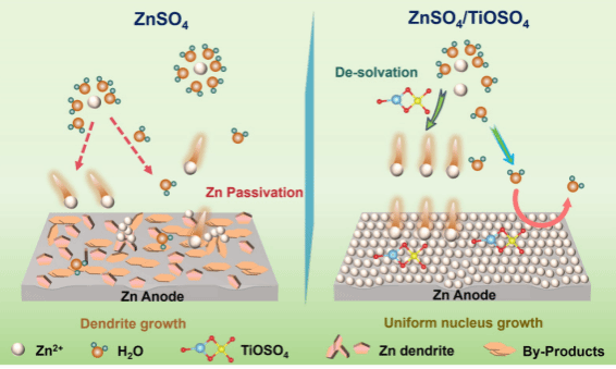 锌金属负极利用效率低和正极材料循环稳定性差的问题严重制约了水系锌离子电池的实际应用。本文重点研究了在硫酸锌电解液中具有独特溶解性的硫酸氧钛(TiOSO4)作为无机添加剂对于锌离子电池的积极作用。在锌金属负极一侧,TiOSO4分子的优先吸附有助于建立静电屏蔽层,保证锌的可逆沉积行为;在NH4V4O10正极一侧,快速脱溶行为有助于抑制溶剂化H2O分子引起的侵蚀反应,稳定NH4V4O10的晶体结构。实验和理论计算表明,TiOSO4分子与Zn2+离子的结合能强于H2O分子与Zn2+离子的结合能,TiOSO4分子在锌负极和NH4V4O10正极表面的吸附能强于H2O分子与Zn2+离子的吸附能。对于锌负极,TiOSO4分子与Zn2+离子之间较强的结合能可以促进脱溶过程和界面反应动力学,而TiOSO4分子的优先吸附则有利于构建静电屏蔽层并诱导锌的可逆沉积行为。在NH4V4O10正极,水合锌离子的快速脱溶动力学可以抑制溶解水分子与Zn2+离子的共嵌入,减少溶解H2O分子与活性V组分之间的副反应,提高界面反应动力学和正极结构稳定性。得益于此,优选的2 M ZnSO4+30 mM TiOSO4电解液,在1 mA cm-2-1 mAh cm-2测试条件下,Zn//Zn对称电池具有超过3750 h的长循环稳定性;在5 mA cm-2-1 mAh cm-2测试条件下,Zn//Cu不对称电池在1000次循环中具有高沉积/剥离库伦效率(>99%)。此外,Zn//NH4V4O10电池在5 A g-1电流密度下循环1700圈,能够保持193.8 mAh g-1的高可逆容量。这项工作预期有助于全面了解无机添加剂的多功能效应,推动无机电解质添加剂在水系锌离子电池中的应用基础研究。