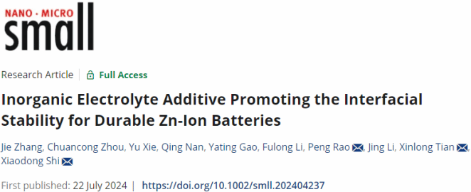 近日,海洋科学与工程学院史晓东副教授所在团队在纳米能源Top期刊Small (IF=13.0)发表题为“Inorganic electrolyte additive promoting the interfacial stability for durable Zn-ion batteries”的研究论文,该论文入选期刊当期热点话题(Hot Topic: Surfaces and Interfaces)。PA集团官网张杰硕士和周传聪博士为论文共同第一作者,史晓东副教授、饶鹏副教授和田新龙教授为论文共同通讯作者,PA集团官网海洋科学与工程学院为唯一通讯单位。