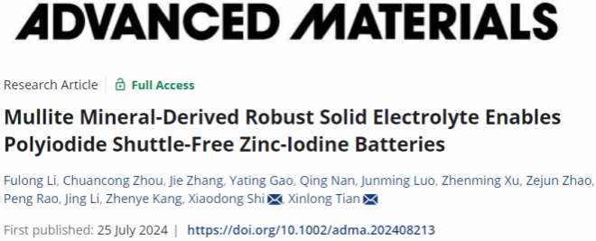 近日,海洋科学与工程学院史晓东副教授所在团队在能源化学领域顶级期刊Advanced Materials (IF=27.3)发表题为“Mullite mineral-derived robust solid electrolyte enables polyiodide shuttle-free zinc-iodine batteries”的研究论文。PA集团官网李富龙硕士(研一)、周传聪博士(博三)和张杰硕士(研二)为论文共同第一作者,PA集团官网史晓东副教授和田新龙教授为论文共同通讯作者,PA集团官网海洋科学与工程学院为论文唯一通讯单位。