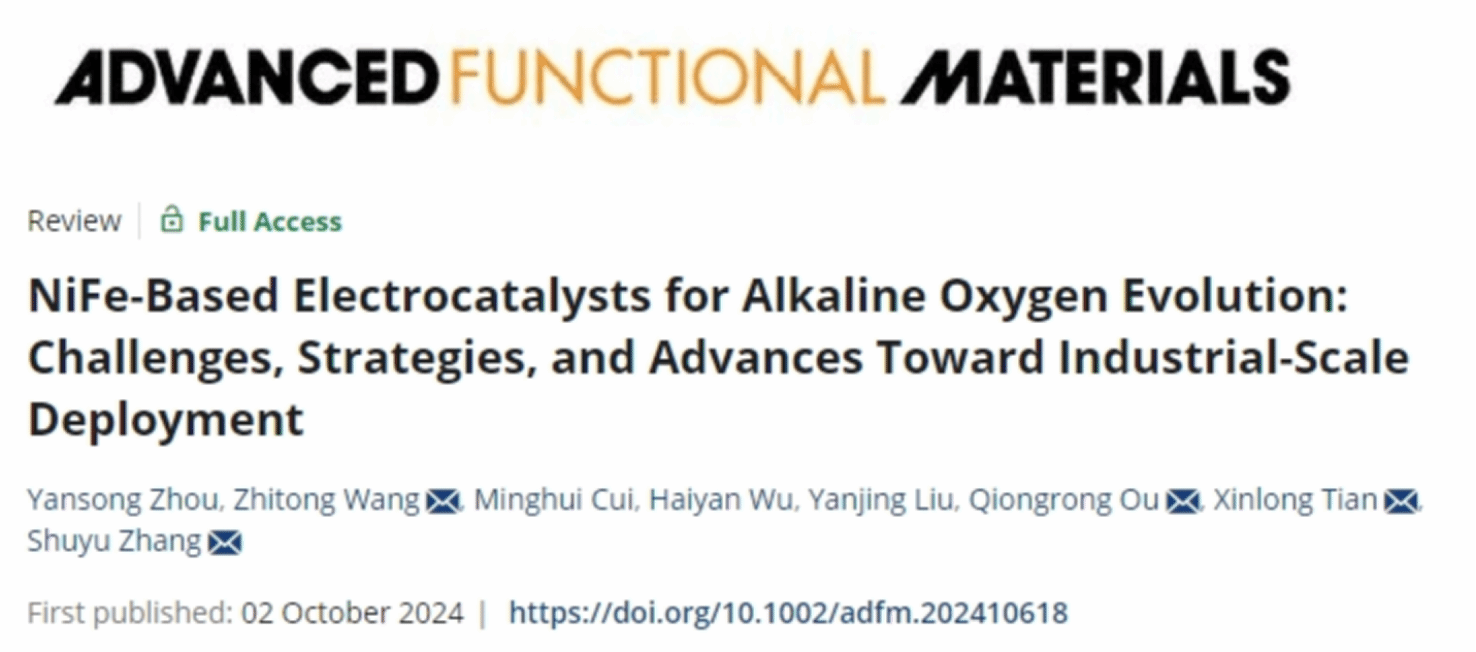 近日,海洋科学与工程学院王志同副教授所在团队在能源化学领域Top期刊Advanced Functional Materials (IF=18.5)上发表题为“NiFe-Based Electrocatalysts for Alkaline Oxygen Evolution: Challenges, Strategies, and Advances Toward Industrial-Scale Deployment”的研究论文。博士研究生周岩松为论文第一作者,PA集团官网王志同副教授和田新龙教授为论文共同通讯作者。