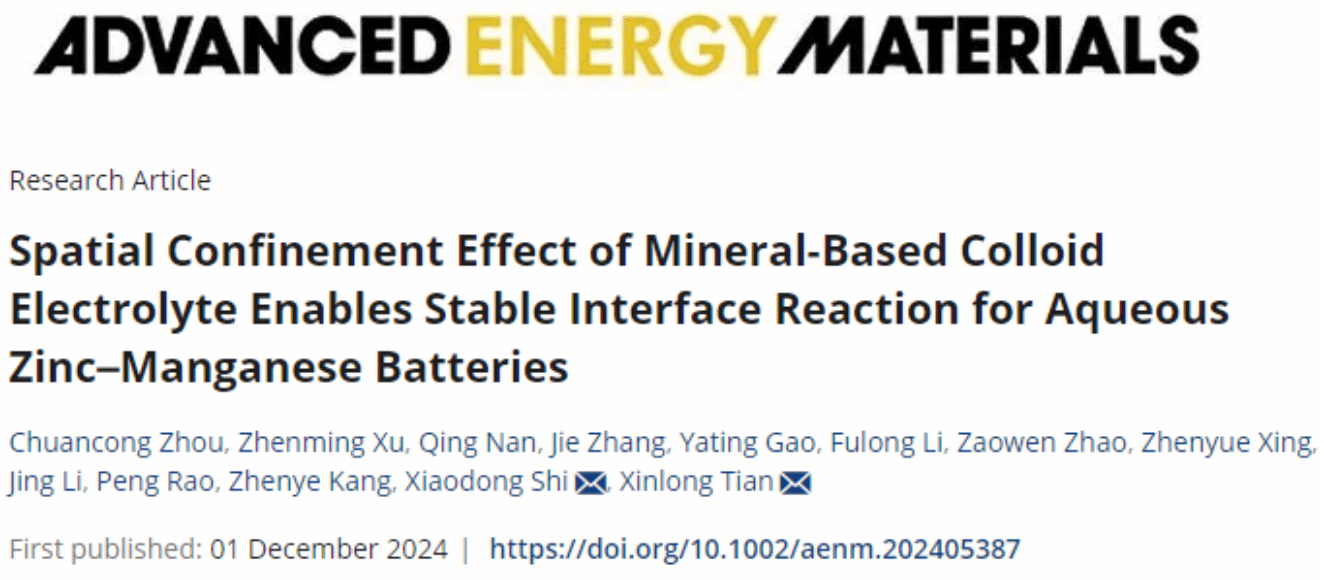 12月1日,海洋科学与工程学院史晓东副教授所在团队在能源领域顶级期刊Advanced Energy Materials发表题为“Spatial Confinement Effect of Mineral-based Colloid Electrolyte Enables Stable Interface Reaction for Aqueous Zinc-Manganese Batteries”的研究论文。PA集团官网2021级博士研究生周传聪为论文第一作者,史晓东副教授和田新龙教授为论文共同通讯作者。