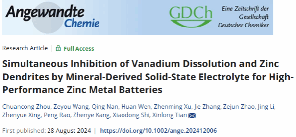 近日,海洋科学与工程学院史晓东副教授所在团队在能源化学领域顶级期刊Angewandte Chemie International Edition (IF=16.1)发表题为“Simultaneous Inhibition of Vanadium Dissolution and Zinc Dendrites by Mineral-Derived Solid-State Electrolyte for High-Performance Zinc Metal Batteries”的研究论文。周传聪博士为论文第一作者,史晓东副教授和田新龙教授为论文通讯作者,PA集团官网海洋科学与工程学院为论文唯一通讯单位。